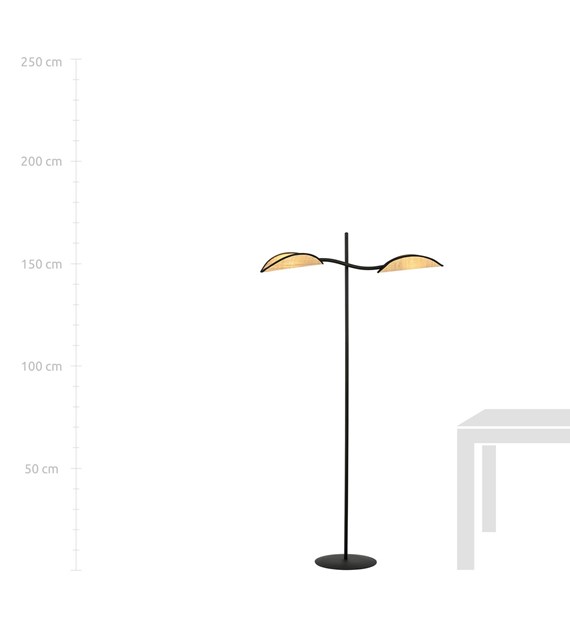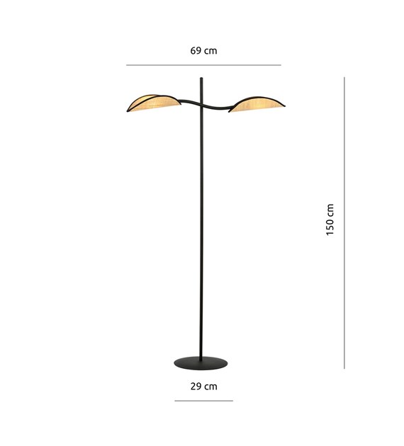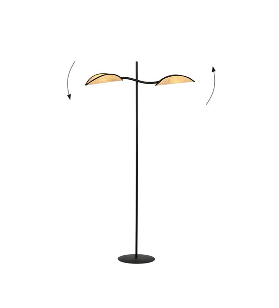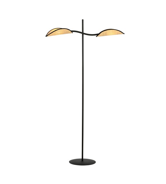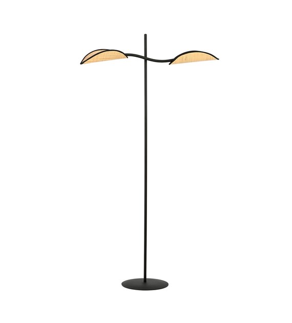 Lampe sur pied LOTUS noir & rotin, abat-jours feuilles design