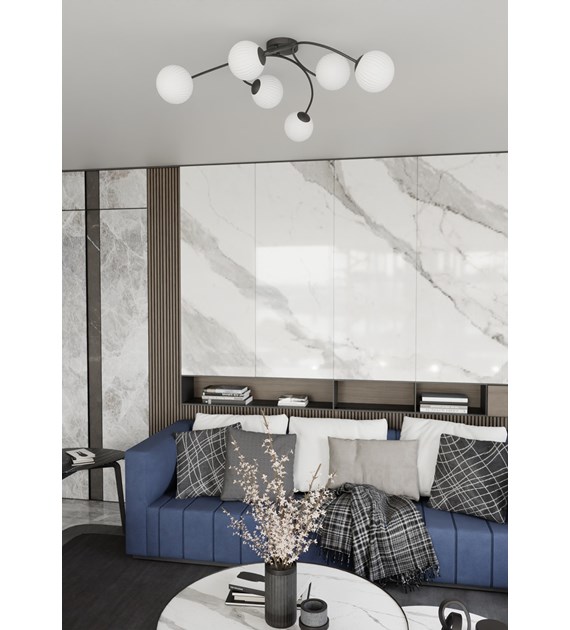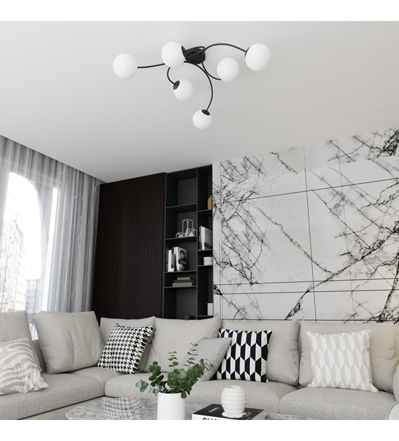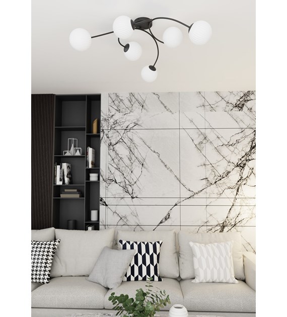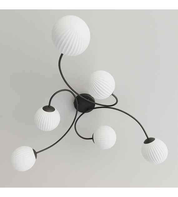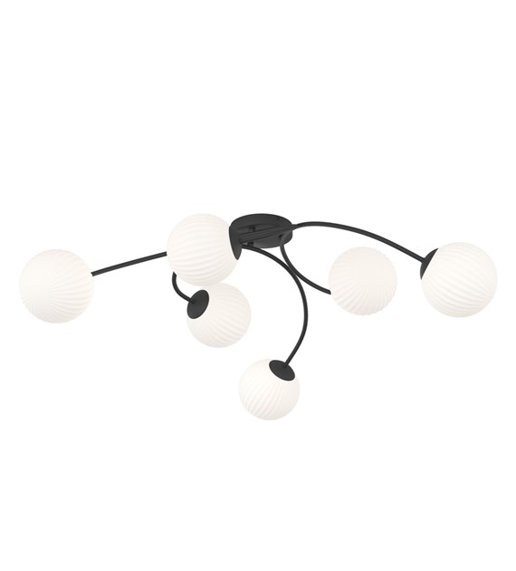 Plafonnier Vibra 6, verre opalin, monture noire, diffusion uniforme