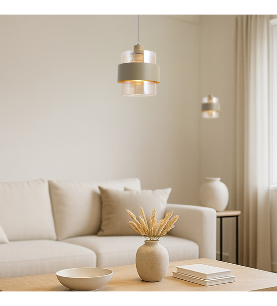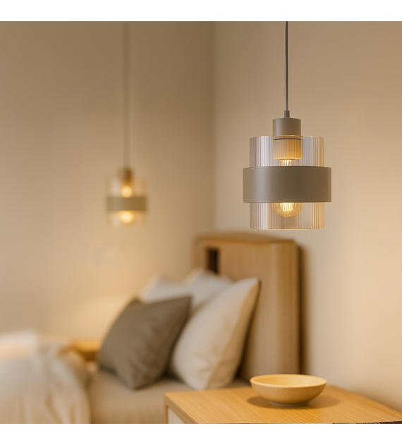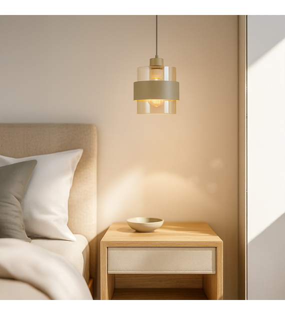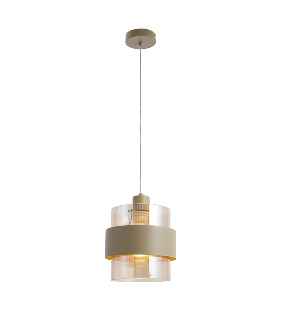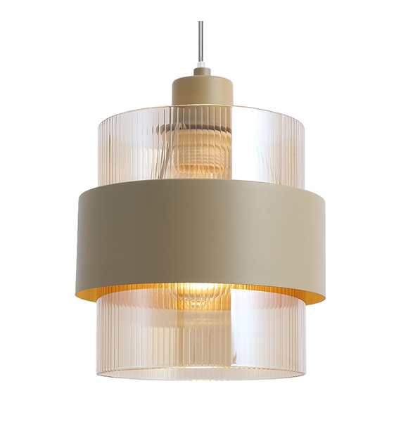 Suspension cylindrique 1 lumière en métal et verre beige 18cm