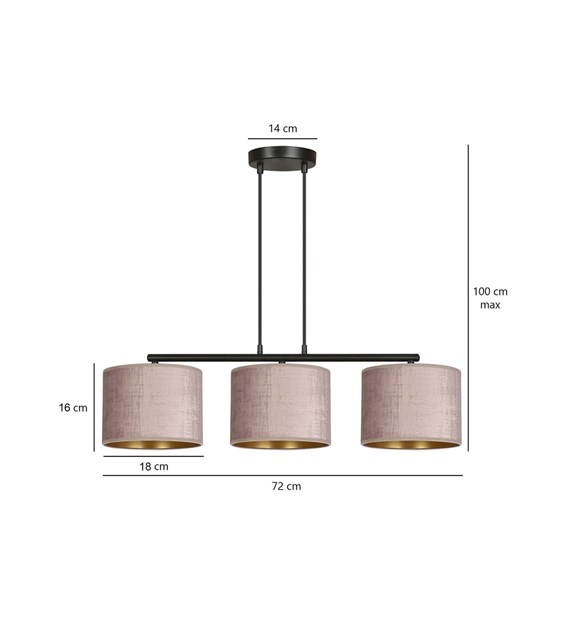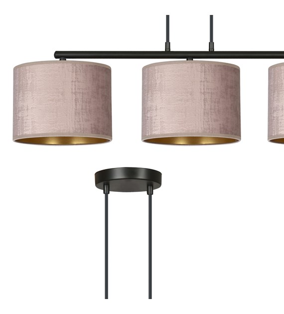 HILDE est une série de lampes avec abat-jour idéale pour les intérieurs modernes comme classiques. La régulation de la longueur des câbles permet un ajustement selon vos besoins. Les abat-jour sont fabriqués en matériau durable avec une texture velours et un intérieur doré. Conception simple et palette de couleurs élégante. Les abat-jour sont disponibles en noir, blanc, gris, vert et rose. Modèle avec 1, 3 ou 4 sources de lumière. Produit 100 % polonais.